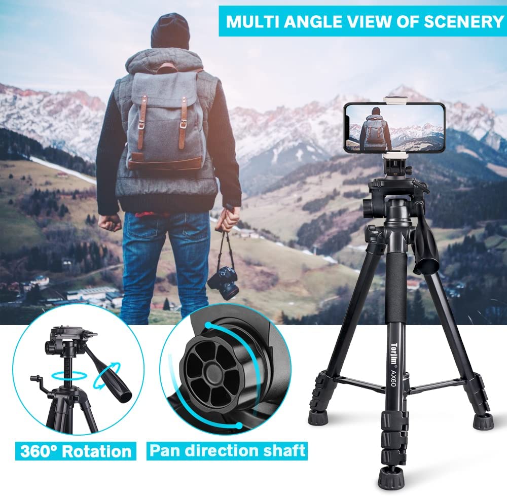 Torjim 60” Camera Tripod with Carry Bag, Lightweight Travel Aluminum Professional Tripod Stand (5kg/11lb Load) with Wireless Remote for DSLR SLR Cameras Compatible with Phone-Black