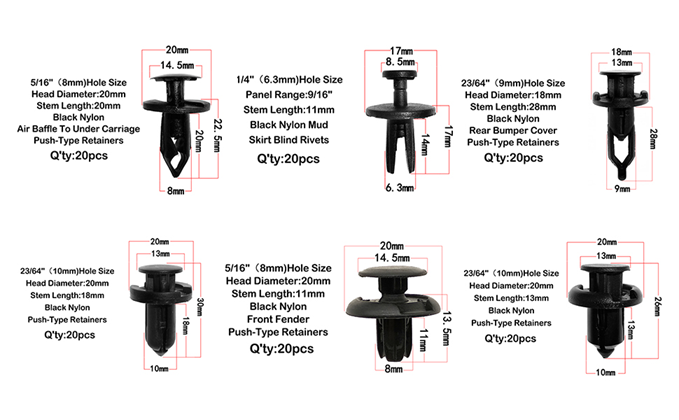 Please check the plastic push pins automotive's size,type and shape to make sure the bumper clips is the one that you need,If you there is any issue after sale such as inappropriate size&shape,please email us directly,we will offer 100% satisfactory service.