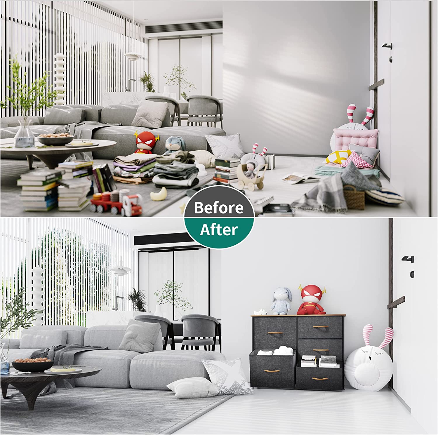 • UNIVERSALLY COMPLEMENTARY- Premium gray fabric drawers, with sturdy black metal frame and wooden tabletop; Enjoy modern scent and stylish aesthetics that easily complements various living spaces: living rooms, bedrooms, hallways, entryways, closets and nurseries, etc.