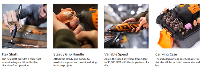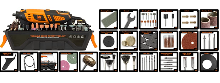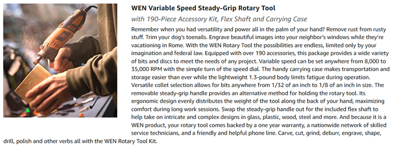 Remember when you had versatility and power all in the palm of your hand? Remove rust from rusty stuff. Trim your dog’s toenails. Engrave beautiful images into your neighbor’s windows while they’re vacationing in Rome. With the WEN Rotary Tool the possibilities are endless, limited only by your imagination and federal law. Equipped with over 190 accessories, this package provides a wide variety of bits and discs to meet the needs of any project. Variable speed can be set anywhere from 8,000 to 35,000 RPM with the simple turn of the speed dial. The handy carrying case makes transportation and storage easier than ever while the lightweight 1.3-pound body limits fatigue during operation. Versatile collet selection allows for bits anywhere from 1/32 of an inch to 1/8 of an inch in size. The removable steady-grip handle provides an alternative method for holding the rotary tool. Its ergonomic design evenly distributes the weight of the tool along the back of your hand, maximizing comfort during long work sessions. Swap the steady-grip handle out for the included flex shaft to help take on intricate and complex designs in glass, plastic, wood, steel and more. And because it is a WEN product. a stocked inventory of replacement parts, and a friendly and helpful phone line. Carve, cut, grind, deburr, engrave, shape, drill, polish and other verbs all with the WEN Rotary Tool Kit. Remember when you had one tool that could do it all? Remember WEN.