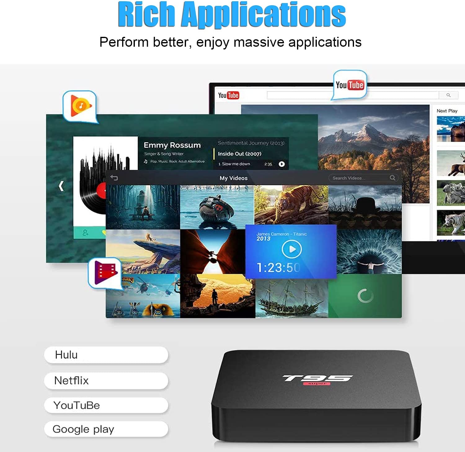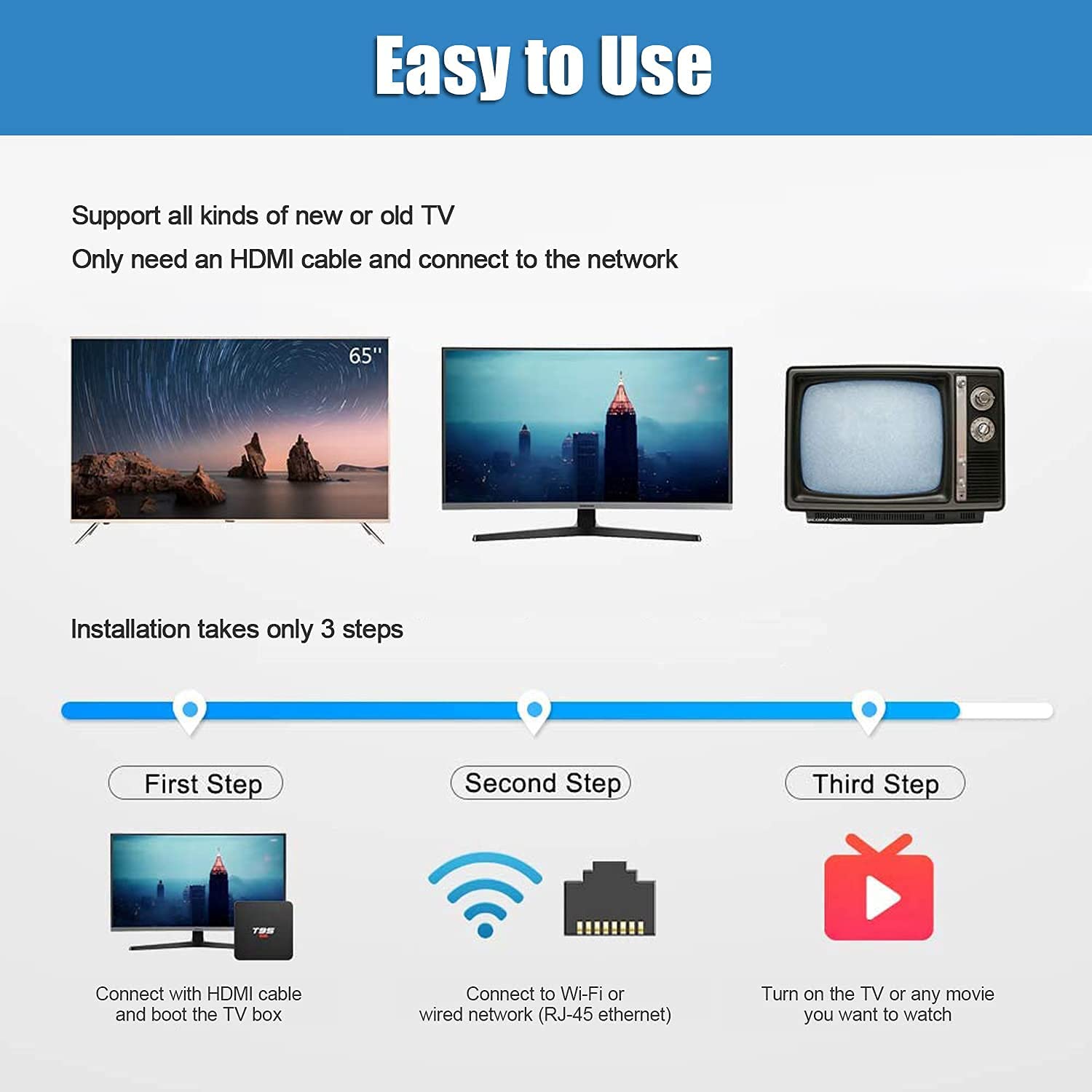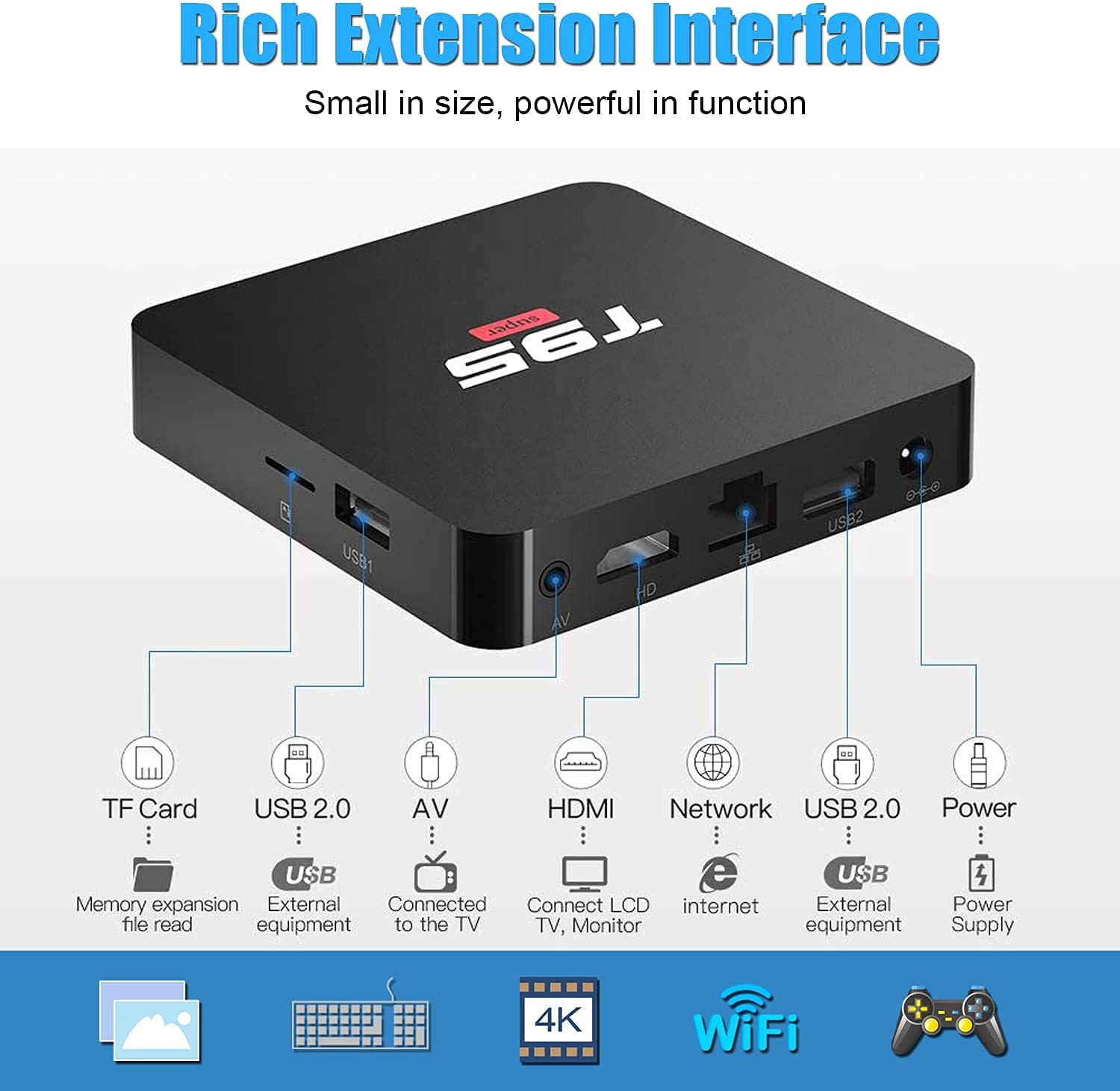 • 【Easy to Use】The T95 Super Android TV box is easy to use. It can be used with old TV or even in any country, only need an HDMI cable and connect to the Internet/Wi-Fi. It supports changing wallpaper and updating the firmware online.