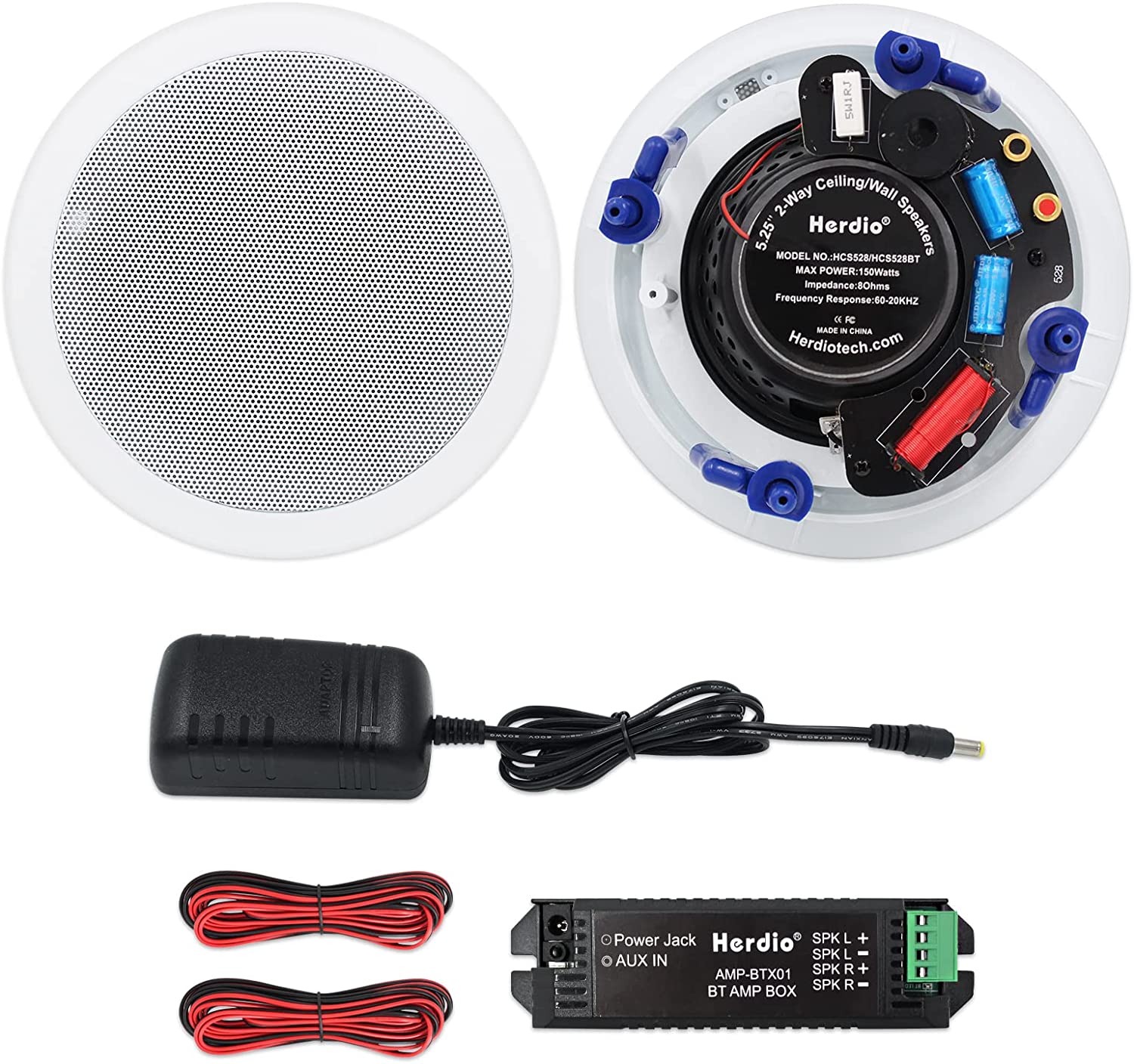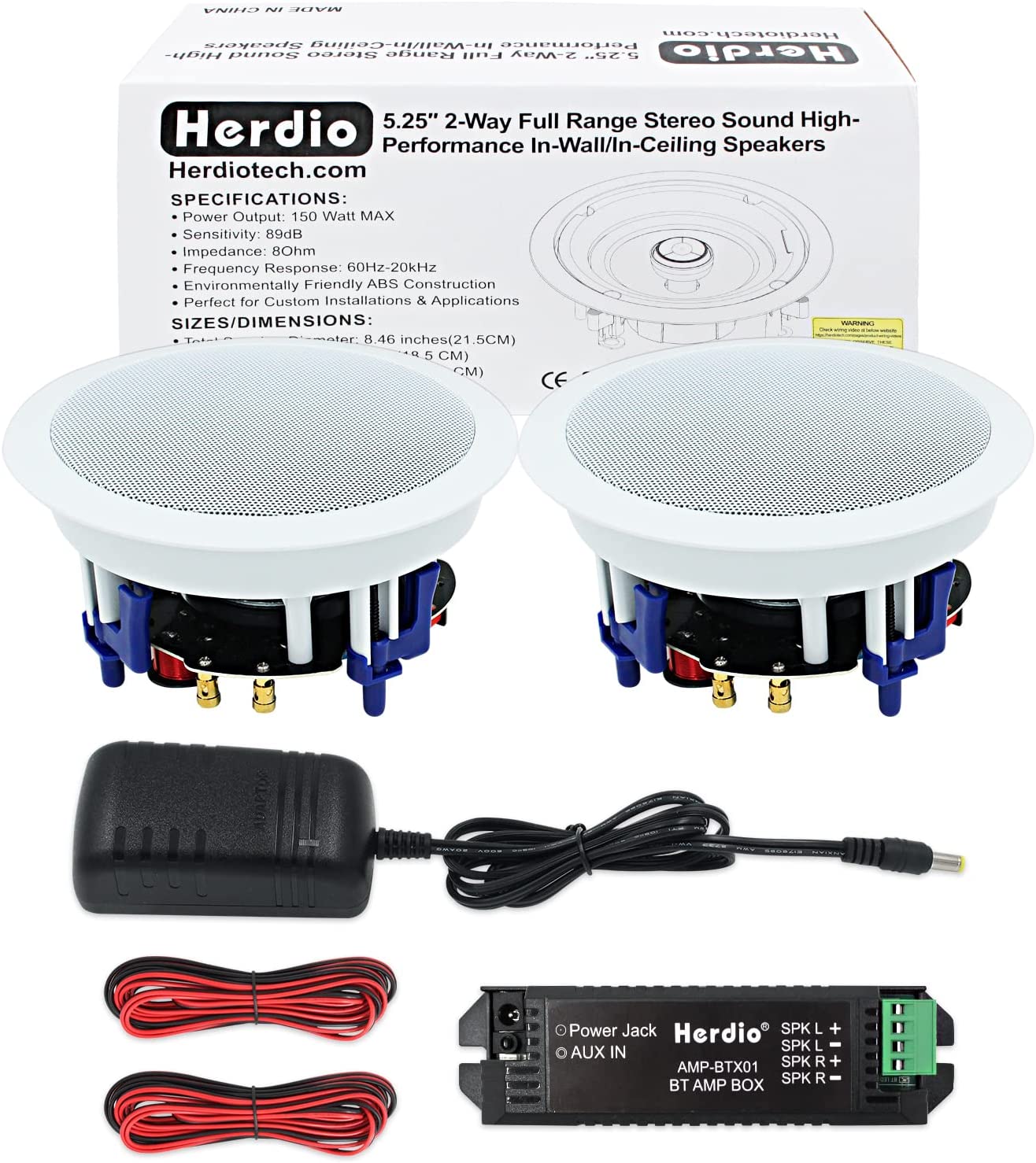 • What's in the box:5.25" speakers x 2 , Speaker Connection Wires x 2, Amplifier Box x 1,Power adapater X 1.
