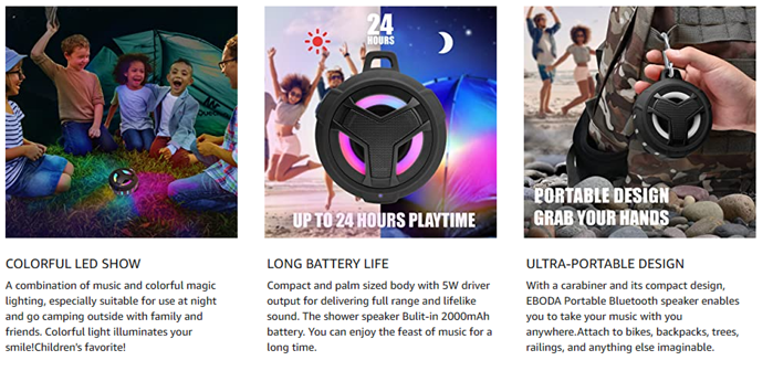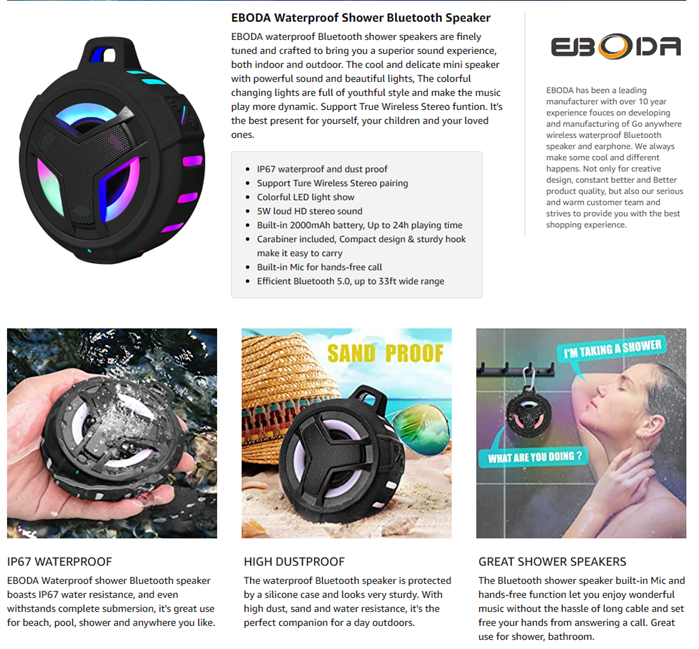 EBODA Waterproof Shower Bluetooth speaker designed with shockproof, drop-proof, dustproof, sandproof ,waterproof functions and can support floating, perfect for pool, bathroom, beach, boating, camping.