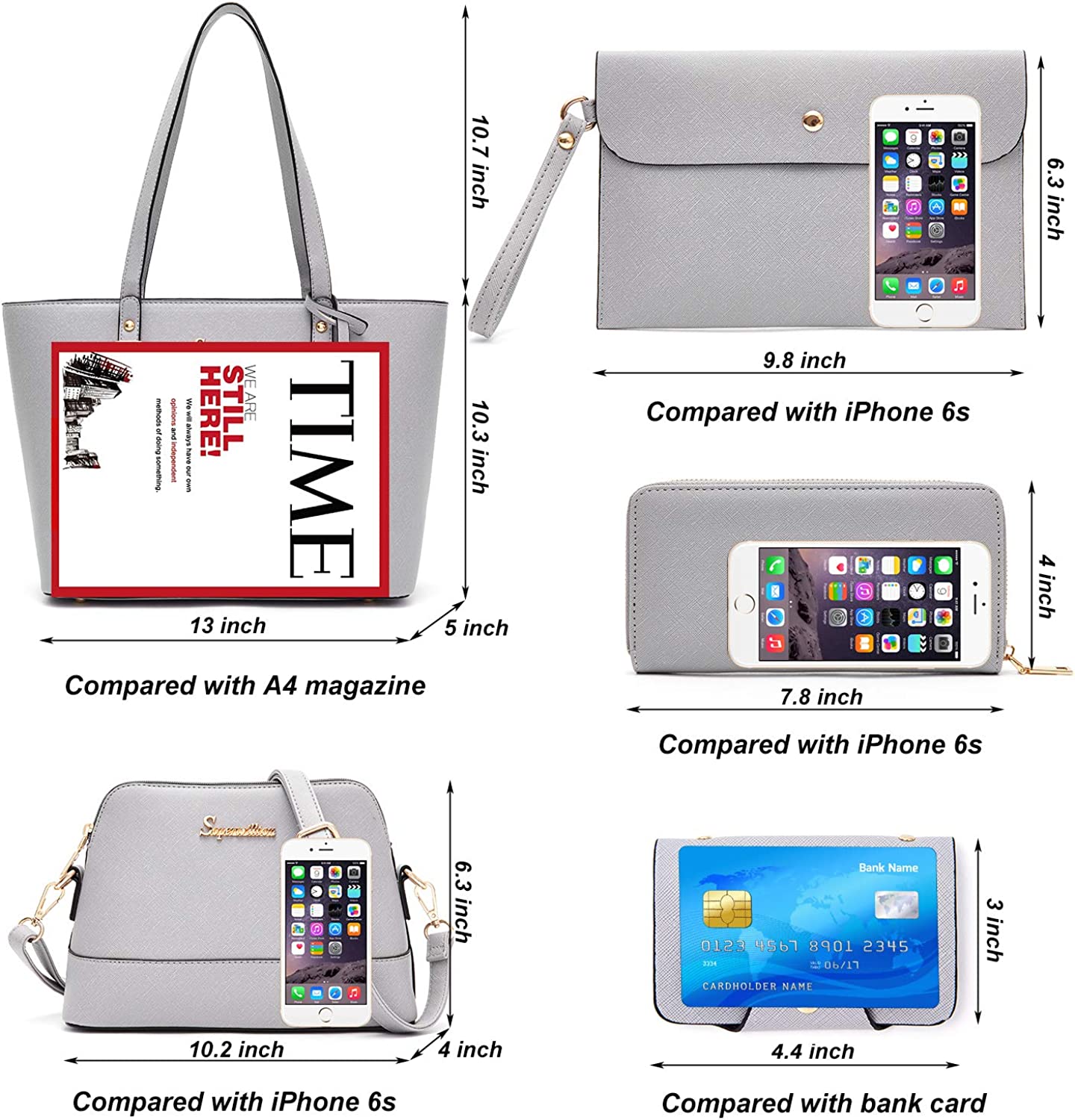 • 【Dimension】 Tote Handbag: 13" x 10.3" x 5"(W*H*D), Strap Height:10.7" Messenger bag: 10.2" x 7" x 4"(W*H*D) Wallet: 7.8" x 4"(W*H) Clutch: 9.8" x 6.3"(W*H) Card Holder: 4.4" x 3"(W*H). You can use them together or individually, suitable for daily use.