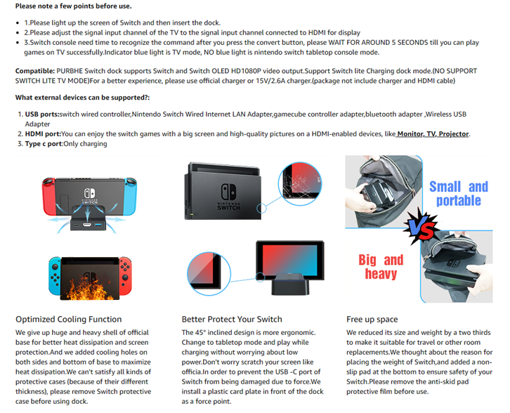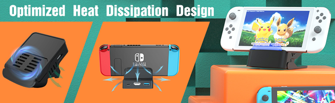 - Optimized Cooling Function: the bottom and sides of this dock are equipped with unique cooling holes, which greatly improves the problem of poor heat dissipation on the dock Nintendo Switch original. Good heat dissipation not only extends the battery life of the Nintendo Switch, but also avoids other problems caused by overheating of the device.