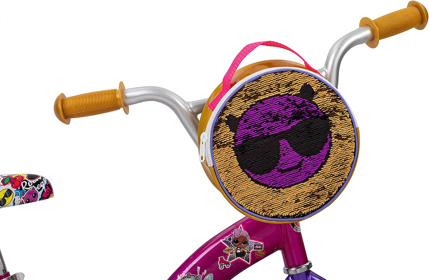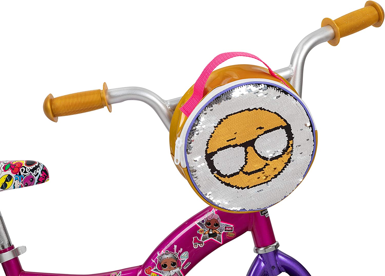 • Coordinated reversible sequin front bag with dual LOL emojis graphics, printed seat and chain guard