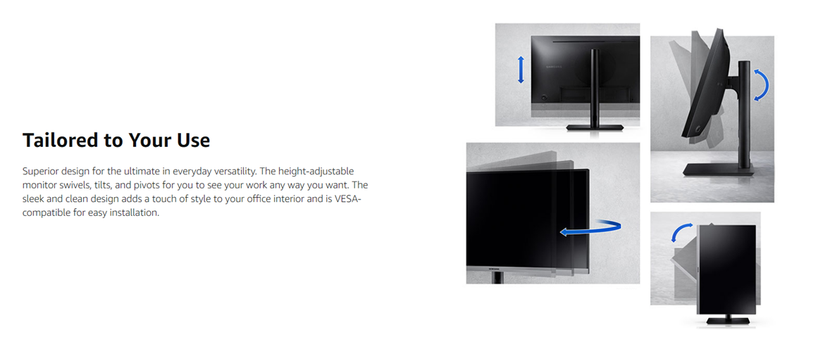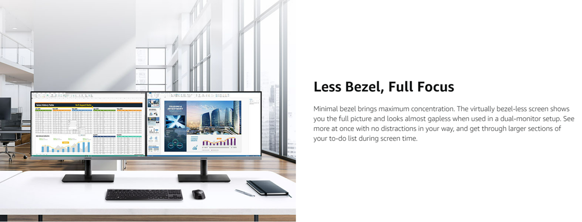 Samsung Business's SR650 Series business monitors utilize enhanced IPS panel technology to preserve color vividness and clarity across every inch of the screen, with up to 178° viewing horizontally and vertically. The virtually bezel-less screen lets you view more, with almost no gap in a dual monitor setup. And with features, versatile connectivity and a fully adjustable stand, the SR650 Series is an ideal cost-effective monitor for your business.