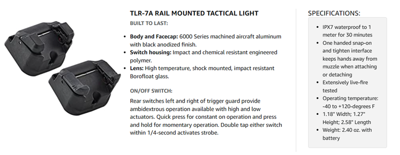 The TLR-7 A includes a customized ambidextrous on/off rear switch in either a Low or High option to match your shooting style. It features a rail clamp that is designed to rapidly attaches/detaches quickly and safely with no tools and without putting your hands in front of muzzle. Securely fits a broad range of full-sized and compact guns. Durable, anodized machined aluminum construction and user enabled strobe function. Engineered optic produces a concentrated beam with optimum peripheral illumination. 2.58-Inch (6.55 cm); 2. 4 oz (68.1g).