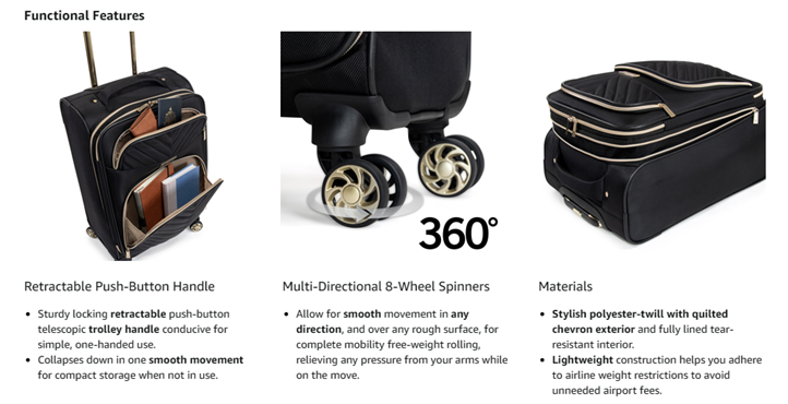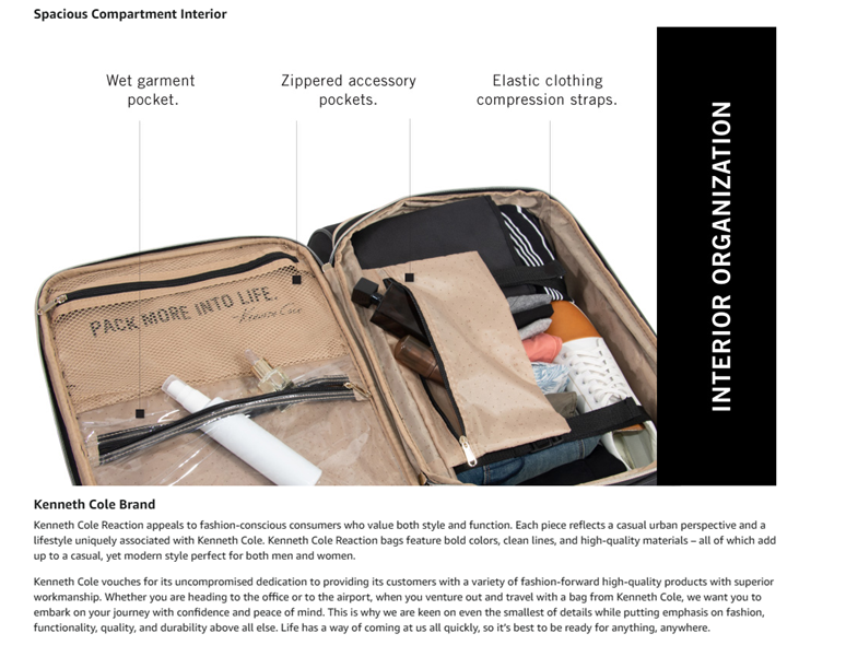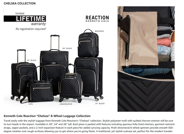 Finally, travel made trendy with the stylish polyester-twill chevron luggage from Kenneth Cole Reaction’s Chelsea luggage collection. Complete with a fully lined, tear-resistant interior, this luggage also expands an additional 2.0 inches, ensuring that you have plenty of space for all your needed belongings. Its lightweight construction helps you meet airline weight restrictions to avoid unnecessary airport fees, while its 8-wheel spinners provide effortless 360-degree navigation allowing you to glide quickly through the airport. The main compartment interior features a hanging side zipper pocket and garment restraints to hold belongings in place. The under-the-lid section includes a mesh zipper pocket and a transparent, clear PEVA gusseted pocket for toiletries. The front exterior also features a small zipper pocket for easily accessible items and a large gusseted zipper pocket for additional storage organization. Padded top and side handles allow for easy maneuvering, and a bottom grab handle allows for easier lifting. Additionally, a retractable trolley handle extends to be 41 inches tall with a locking push button mechanism. Fashionable and functional, Chelsea luggage also boasts fashion-forward gold hardware with premium self-repairing coil zippers designed for long-lasting use. Carry-on size meets most U.S. based airline carry-on size requirements and fits into most airline overhead bin compartments. Backed by a manufacturer 10-year limited warranty. ★ Overall Dimensions: 22.0” H” x 14.0” L x 9.0”-11.0” D. ★ Packing Dimensions: 20.0” H x 13.5” L x 8.5”-10.5” D. ★ Weight: 6.35 lbs. ★