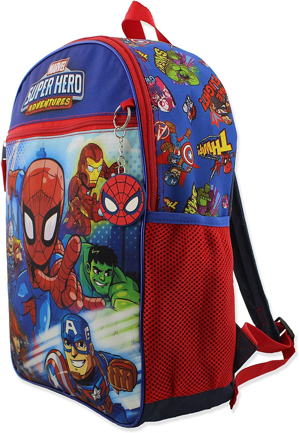 5-PIECE SUPER HERO ADVENTURES BOYS BACKPACK SET - This 5-piece Marvel Super Hero backpack and snack bag set is a great value. Included in this set is a stylish 16 inch backpack, a fold-able snack bag, a soft utility pencil case, a cool drawstring sack, and a Spider-Man Circle Logo Rubber Keychain. This matching set is the perfect back-to-school set at a very affordable price.?This backpack measures approximately 16" X 12" X 4". MULTIPLE COMPARTMENTS TO KEEP THINGS ORGANIZED - This Marvel Super Hero backpack school set helps your child keep organized throughout the day. The book bag contains a large main zip compartment, and a front zip compartment that easily stores pencils, and other supplies! Store a water bottle in the side pockets, snacks in the fold-able snack bag, and smaller items in utility pencil case.? WELL CONSTRUCTED AND COMFORTABLE - This quality book bag can be hung up when not in use by the? webbed locker loop. This school bag is designed in durable fabric with adjustable shoulder straps. The length of the shoulder straps is adjustable for the perfect fit. The side mesh pockets are made from athletic mesh for extra durability. FUN AND STYLISH - This book bag school set features your favorite Marvel Super Hero Adventures characters: Spider-Man, Thor, Ironman, Hulk, Black Widow and Captain America! It's the perfect travel, school, or camp set for any Marvel fan! THE PERFECT GIFT! - Marvel Super Hero Adventures school supplies sets make the perfect back-to-school, birthday, or Christmas gift. Why? They are well constructed, feature awesome Marvel characters, and are very affordable. It's the perfect backpack set for a day at camp, back-to-school, or for travel! If you love Marvel Super Hero Adventures, this set is for you!