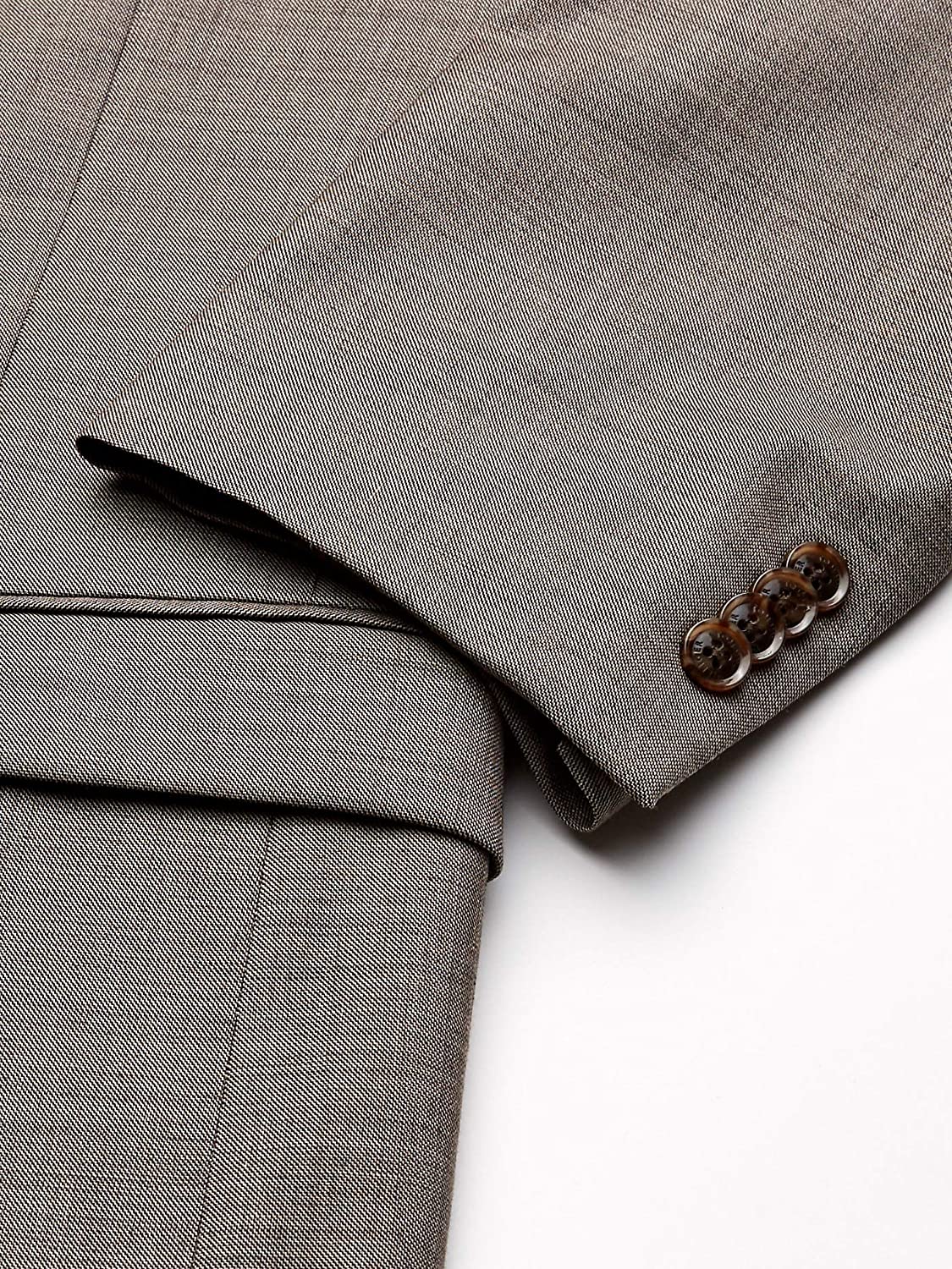- Side vented, flap-pocket jacket and flat front, non-cuffed pants for a sleek, contemporary look