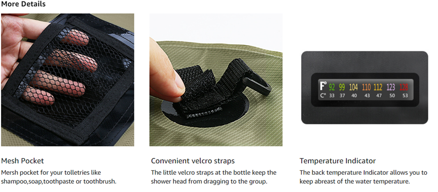 Features :All bag materials are Environmental FriendlyWater capacity of 5 gallons (20 liters) Use solar energy to heat water to 45°C (113°F) in few hoursTemperature indicator (°C/°F) for water temperatureFlexible hose & shower head includedAdvanced shower head : ON/OFF switch & switchable from LOW to HIGH water currentLight weight & foldable, easy for carry & storage