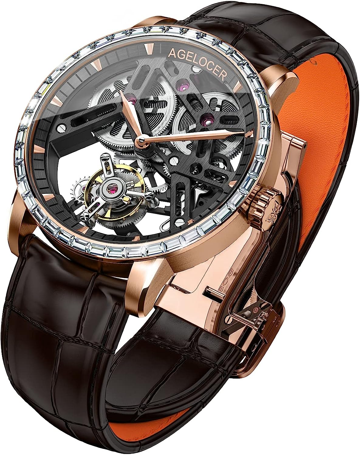 ⌚Flying Tourbillon Movement: Equipped with 80 hours power reserve, double-spring linkage system, incabloc triangle shock absorber, 4HZ vibration frequency, 25 ruby bearings, the men's dress watch use high-grade satin brushed & polished, keep time accurate.