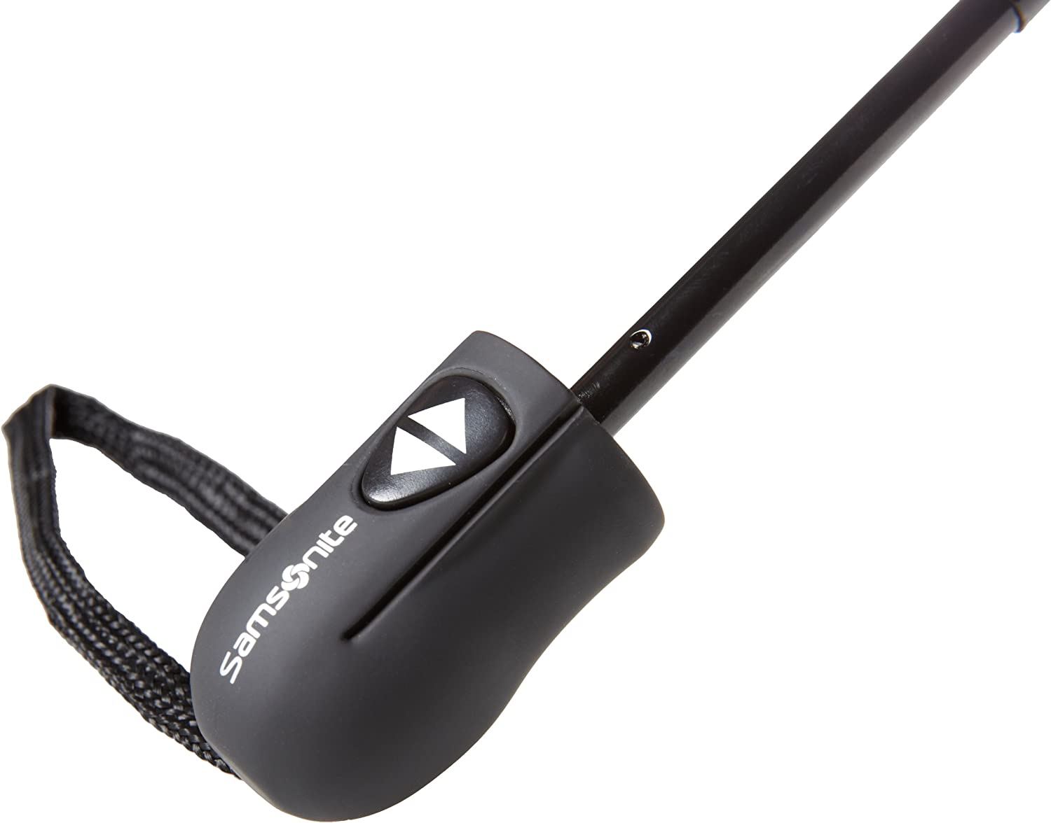 Automatic open/close. Teflon-coated polyester wind guard canopy. Samsonite-branded TPR round handle. 10" folded length.