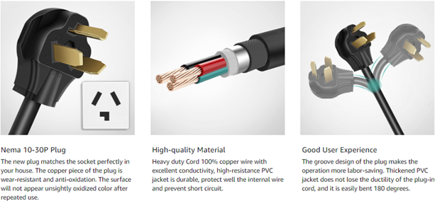 - Dryer Adapter Cord: Connect the 3 prong Nema 10-30P male plug to the female wall outlet of Nema 10-30R, and plug your dryer 4 prong Nema 14-30P plug to the female cable socket (Nema 14-30R).