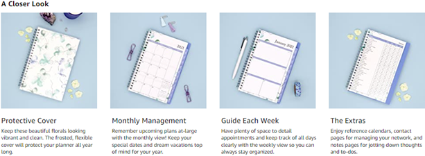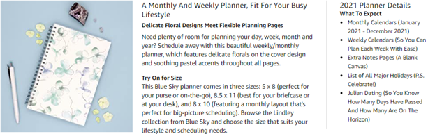 Need plenty of room for planning your day, week, month and year? This stylish weekly and monthly planner will keep you organized everywhere you go. Simple page designs add a touch of elegance and offer plenty of room for all of your important information. Monthly calendar tabs allow for easy access to each monthâ s plans while weekly views offer ample writing space for detailing each day. Stay on track throughout the year with this beautiful planner dated January 2021 - December 2021. High quality white paper provides clean writing space for jotting down your appointments, to-dos and reminders. Durable coated tabbed dividers are long lasting and make accessing information a breeze. Use this dated planner to stay on track for appointments, and to jot down notes and ideas in one place. Premium quality covers and twin-wire binding. Mix and match with other Lindley Collection planning products from Blue Sky to organize your daily life. Blue Sky creates modern and sophisticated organizational planners and calendars to fit the scheduling needs of busy people - whether business professionals, college students, teachers, or anyone with appointments to make note of. Keep your life organized with our full line of products including desk pad calendars, wirebound tabbed weekly and monthly planners with contacts and notes pages to accommodate your scheduling needs, and laminated two-sided wall calendars, all in a variety of colors and patterns to suit your lifestyle and personality.