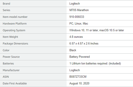 Logitech Wireless Mouse Marathon M705 lets you power on... and on. It uses far less power than comparable wireless mice from other companies, so you'll go up to three full years between battery changes.* And it uses a tiny wireless receiver that stays plugged in to your computer, so your mouse is ready to go-whenever, wherever, and for as long as it takes. Plus, hyper-fast scrolling means you'll fly through long documents to find what you need in a flash. Advanced Optical Tracking means you'll get smooth, responsive cursor control. And the sculpted, right-hand shape means you'll be as comfortable finishing up as you were getting started.