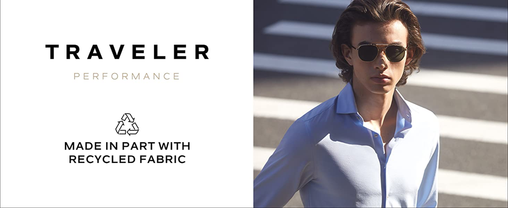Look neat while on the move in the Traveler dress shirt, made in part with recycled material. It features 4-way stretch and moisture-wicking properties for unrestricted movement and dry comfort, while the ultra wrinkle-free fabric offers easy care at home and less ironing.