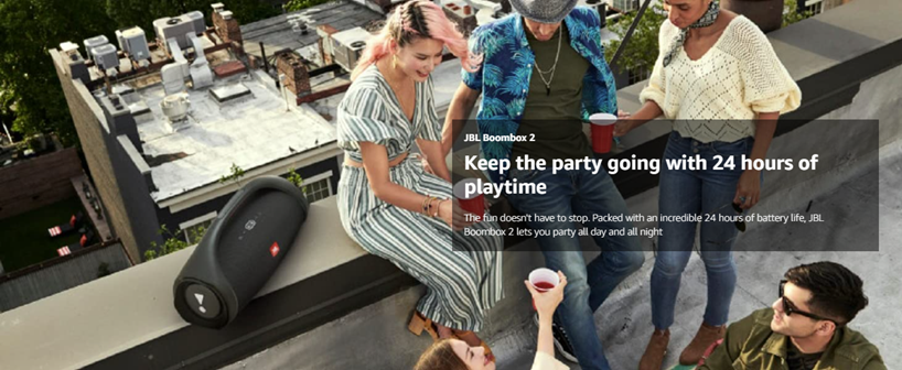 • 24 HOURS OF PLAYTIME: The fun doesn't have to stop. Packed with an incredible 24 hours of battery life, JBL Boombox 2 lets you party all day and into the night.