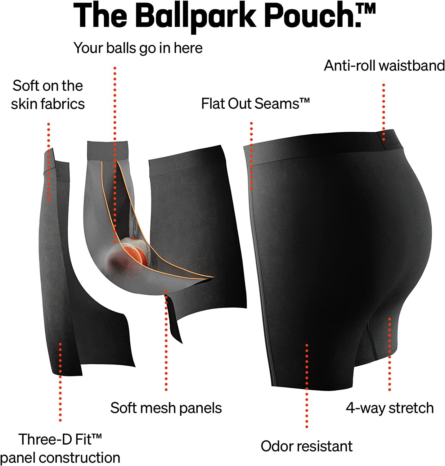 Quest Long Leg Boxer Briefs - Our Quest Long Leg Boxers are perfect for all your travel adventures. Featuring a slim fit and a fly, the Quest long boxer brief sits just above the knee with an 8" inseam. It's made from ultralight, quick-drying, pin-dot mesh fabric for wash-and-go wearability. The digitally printed graphic waistband adds personality to life on the road! BallPark Pouch - Each pair of our boxer briefs comes equipped with the BallPark Pouch. Designed to reduce friction while keeping everything supported and securely in place, this patented pouch technology features breathable fine mesh panels for chafe-free all day comfort. No Rubbing or Chafing - Quest Long Leg Boxer Briefs are constructed from our quick-dry fabric blend of moisture-wicking nylon, spandex, and polyester for all day comfort and support. Designed to keep moisture away from your skin and prevent chafing, the boxer briefs feature Flat Out Seams, which place the softer, flatter side of the underwear seam against skin. The boxer briefs have a Three-D Fit design which builds the underwear from nine panels around the thighs, hamstrings, quads and glutes to support every move you make. Take Action - Quest boxer briefs are an essential addition to any packing list. Pick up a pack of the soft and comfortable lightweight men’s boxer briefs and throw them in your backpack or suitcase – you’re good to go.