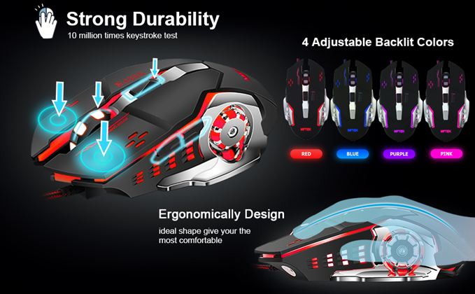 - 【LED Backlit Gaming Mouse】: 4 LED colors (Blue/Red/Purple/Rose) adjustable gaming mouse, unique breathing light provides a soothing and calming ambient light. Defaulted backward and forward buttons, Fast forward and backward when browsing web. Comfortable curves of the mouse give you the most comfortable gaming experience ever.