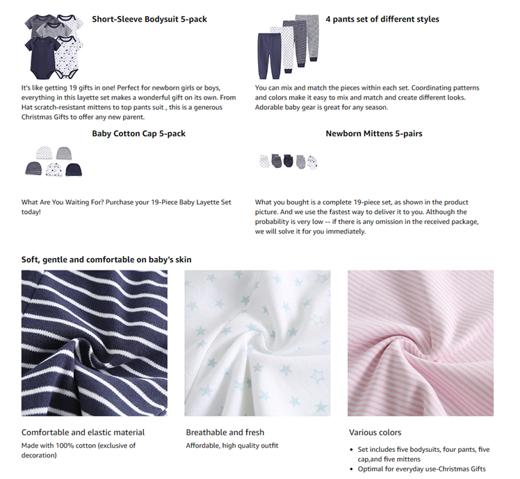 Set includes five bodysuits, four pants, five cap,and five mittens