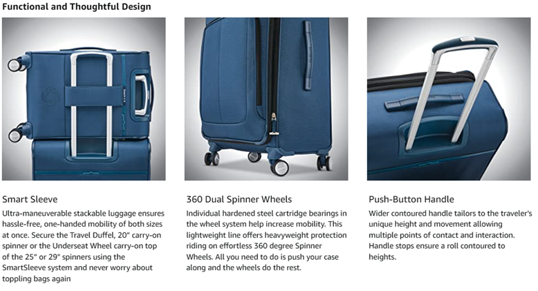 - FOUR MULTI-DIRECTIONAL double spinner wheels allow 360 degree upright rolling so there is no weight on your arm or shoulder