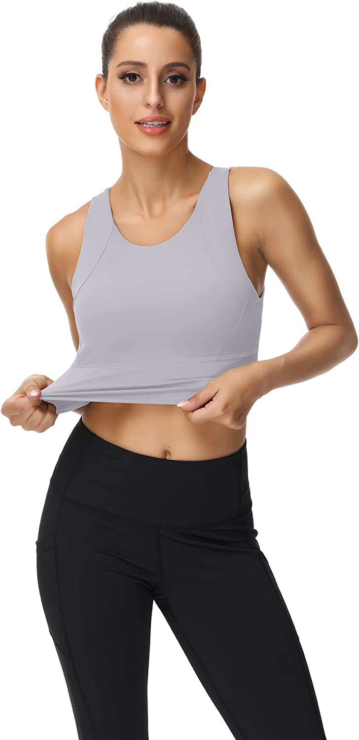 - High Neckline Cropped Tank: With wide straps and built in shelf bra,this long line sports bra two-tone yoga crop top provide you with high coverage to hold your "girls" in, but also offer you great support to keep your bras staying in place better. A full range of motion always let you twist with ease during exercising.