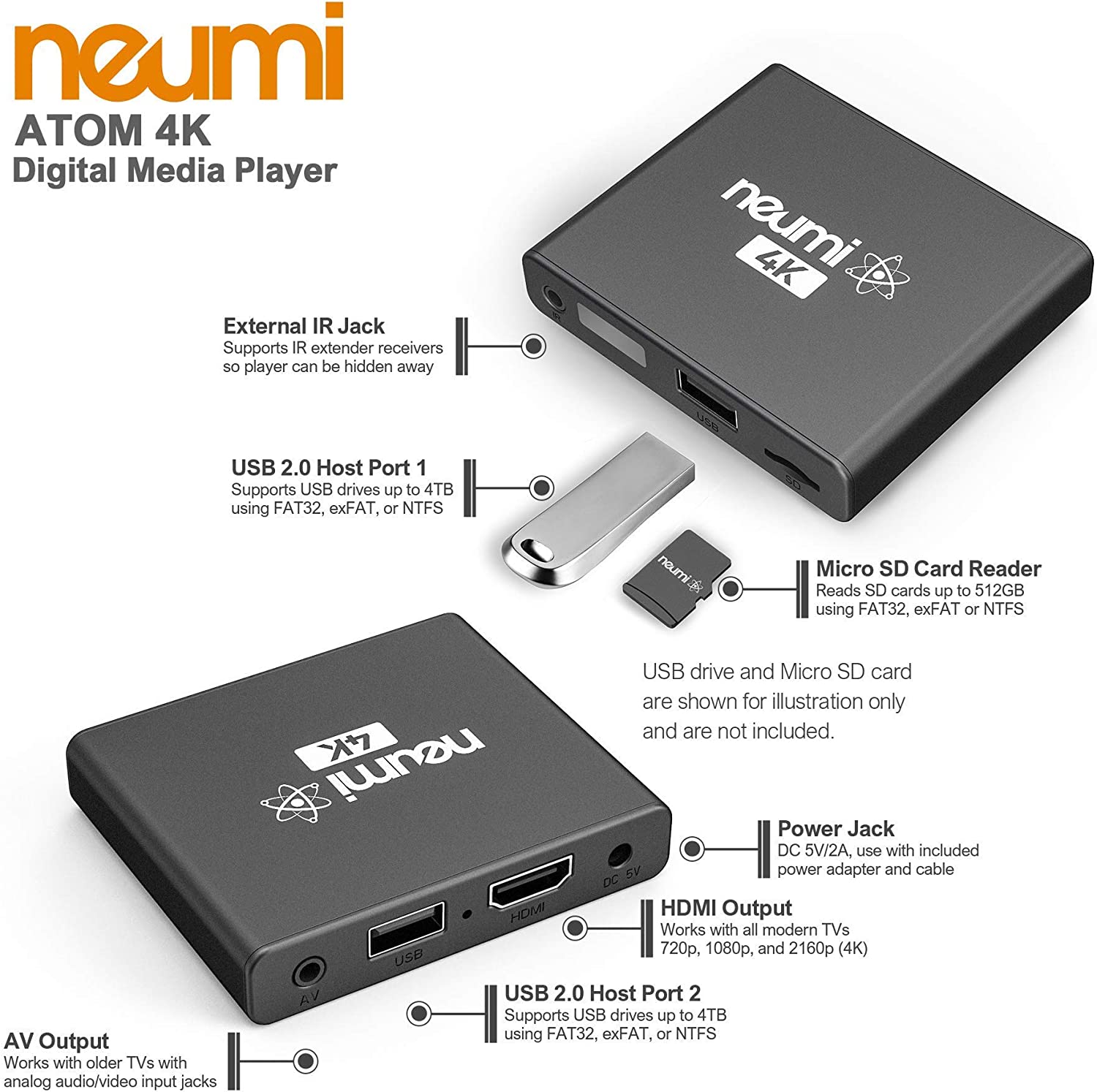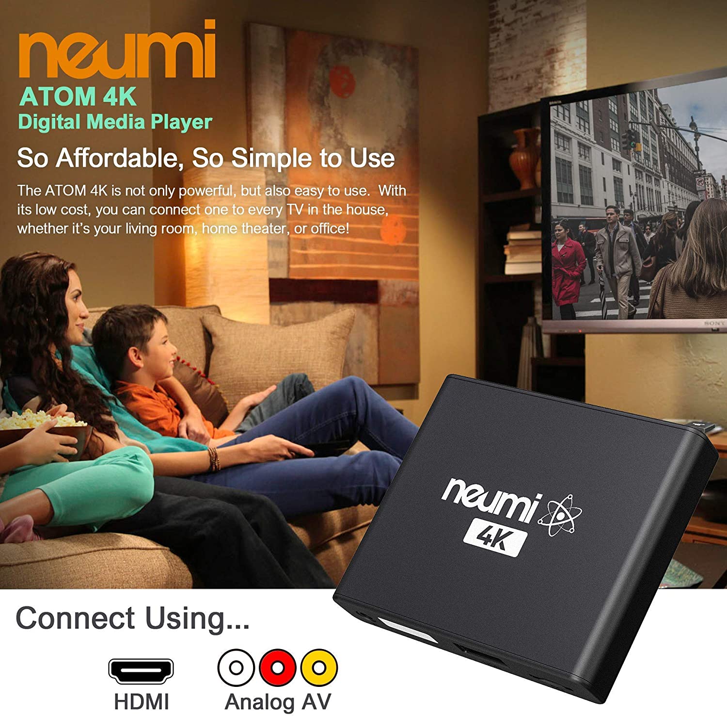• The NEUMI ATOM 4K is the easy and affordable way to add video, photo, and music playback to any TV, new or old, at up to 4K Ultra-HD quality. Just attach a USB drive or SD card with your media files, select a file, and play! It is simple and intuitive to use with no complicated settings or controls. Turn on its automatic playback and resume capability and you won’t even need to pick up the remote.