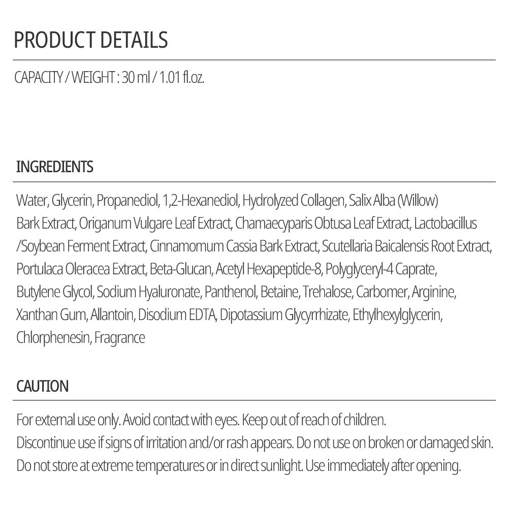 • 7 SYNERGY - The 7Synergy meets with collagen allowing a stronger firming skin. The 7 ingredients used are oregano, fermented bean, white willow, portulaca, scutellaria baicalensis, cassia bark, and cypress. These 7 ingredients have the effect of moisturizing, intensive hydrating, pore-care, soothing, softening, skin protecting, and nourishing in order. The interaction between the 7 botanic ingredients help restore healthy balance and vitality.