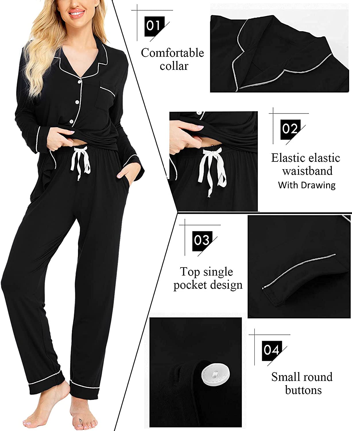 ❤TWO-PIECE CUTE SLEEPWEAR:Our pajama set consist of long sleeve boyfriend style top and long pant.Notch collar and the button-front top with a chest pocket and contrast piping,drawstring elastic waistband makes it fit better.Enjoy your next pajama party in this comfy soft PJ set