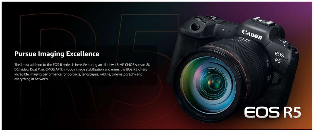Canon’s all-new 45 Megapixel full-frame sensor is at the heart of the EOS R5’s superb image quality, which also leads the way for impressive8K DCI cinematic movie capture with the ability to extract 35.4 Megapixel still images. Focus and speed are paramount in the EOS R5, providingimpressive continuous capture at speeds of up to 20 frames-per-second and with Dual Pixel CMOS AF II capability, to track split secondmovements of even the most elusive of subjects. With 1,053 Automatic AF zones, it is easier than ever to photograph people with the use ofEye, Face and Head Detection AF, or intuitively track the whole body, face or eye of cats, dogs, or birds with Animal Detection AF. The 5-axisin-body image stabilization can effectively compensate for camera shake with approximately 8 stops of stabilization with use of both non-stabilized,and optically image stabilized lenses. Connectivity like 5GHz and 2.4GHz Wi-Fi and Bluetooth, is also included.