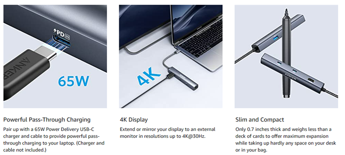 With a total of 6 ports, you can expand the functionality of your laptop’s single USB-C port to include Power Delivery pass-through charging, media display, ethernet connectivity, and data transfer.