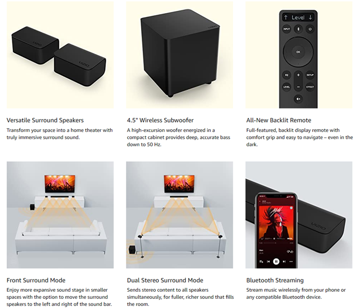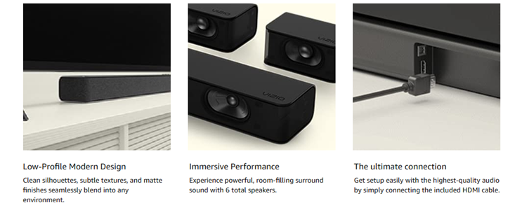• America's #1 Sound Bar* - VIZIO has been filling homes with truly immersive audio for over 10 years, and our sound bars just keep getting better. We are proud to provide our customers with top-tier audio products that bring movies, shows, podcasts, music, and more to life like never before. (*#1 Sound Bar Brand in 1H 2022 Source: The NPD Group/Retail Tracking Service, U.S., based on units, Jan. - June 2022 combined.)