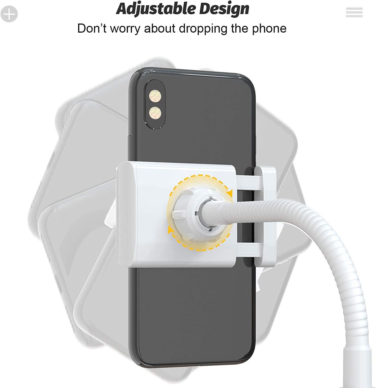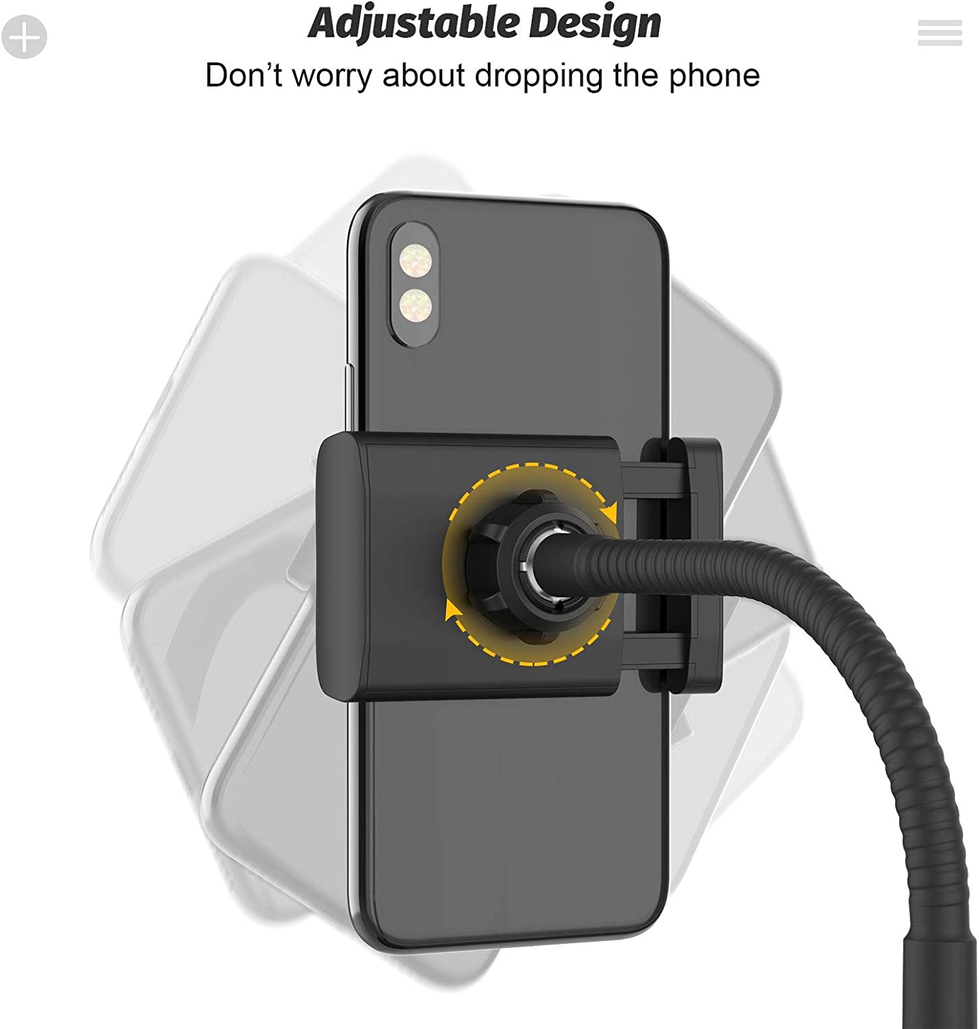 • ? 【 Height & Angle Adjustable 】: The phone stand for desk has a flexible 15 cm gooseneck arm with a 360-degree swivel ball head that provides a multi-directional viewing angle. The height can be easily adjusted between 22.7 cm- 31 cm .You can easily adjust to a comfortable angle under any circumstances for convenience for every viewing which helps to fix your posture and reduce neck & back strain.