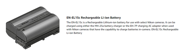 The EN-EL15c is a Rechargeable Lithium-ion battery for use with select Nikon cameras. It can be charged using either the MH-25a battery charger or the EH-7P charging AC adapter when used with Nikon cameras that have the capability to charge batteries in-camera.