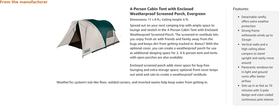 Model Name | Coleman Cabin Camping Tent Weatherproof Screened Porch |