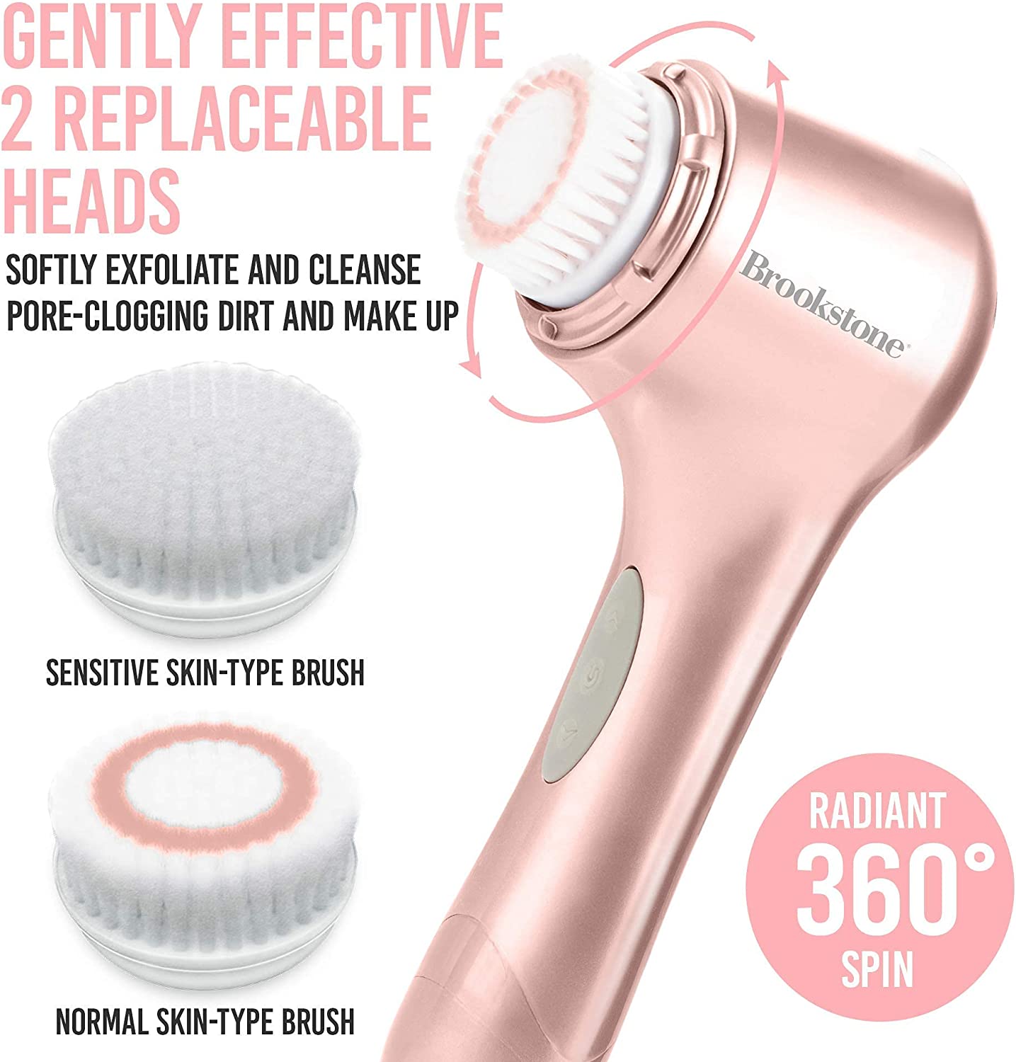 • The Cleansing Facial Brush : Included in the box is our most popular rose gold face wash brush that has soft set brush and runs on AA batteries. Portable face brushes for cleansing and exfoliating remove the dirt and debris of the day without scratching your face. Ours comes with a handy additional interchangeable spin brush (included)