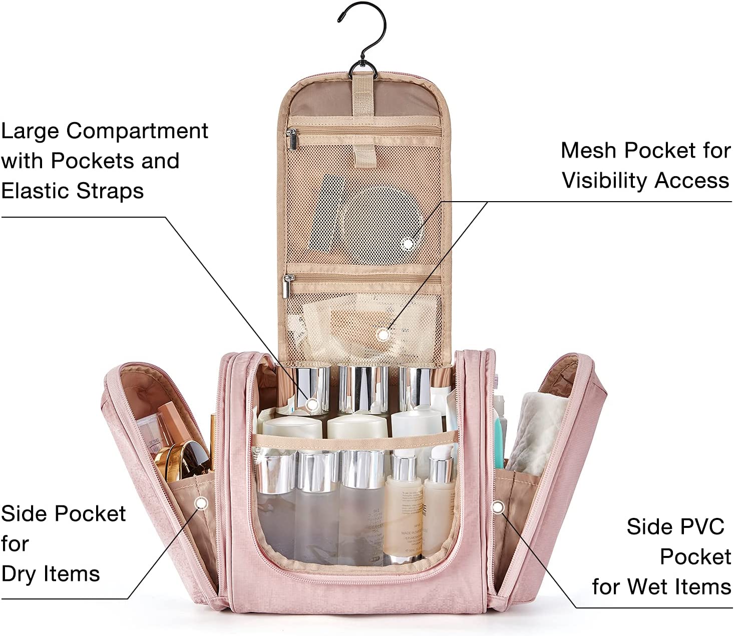 Special Design - Inner pockets with elastic straps hold bottles upright. Two side pockets of travel toiletry bag can keep the wet/dry items separated. The right side pocket with PVC material is easy to clean and dry, perfect for makeup brushes, toothbrushes, wet towels. Stow-away 360 degree swivel non-slip metal hook for versatile hanging options.Can be gifts for Women on Black Friday,Cyber Monday,Christmas day.