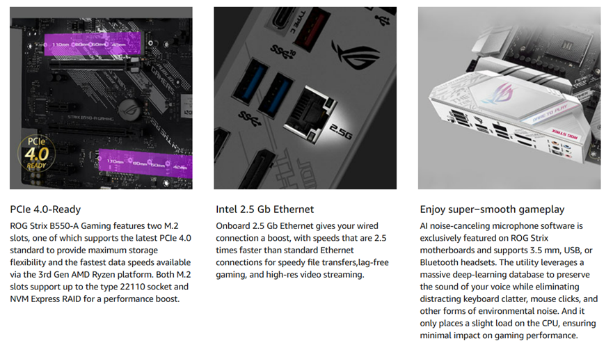 Experience next-level performance and connectivity with the ROG Strix B550-A Gaming, featuring PCIe® 4.0 and 2.5Gb Ethernet. Robust power and effective cooling make the ROG Strix B550-A Gaming the perfect partner for 3rd Gen AMD Ryzen™ CPUs. Futuristic aesthetics, intuitive software, and a reliable Stack Cool 3+ design put your build in the winner’s circle. Free 3-months Adobe Creative Cloud Subscription: Receive complimentary access with the purchase of this product (offer valid from 9/15/2021 to 9/15/2022) visit https://www.asus.com/us/content/asus-offers-adobe-creative-cloud/ to claim.
