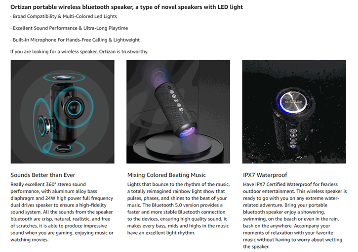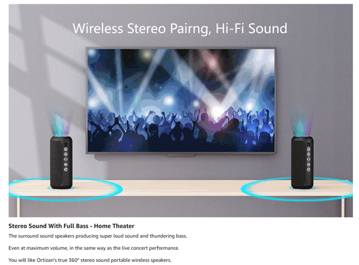 • [Hi-Fi Stereo Sound and Dual Pairing Function]: Ortizan Bluetooth speaker equips with 24w of stereo audio drivers speaker and an advanced digital signal processor, which pumps out crisp treble, detailed mids, and specially enhanced bass at any volume. You can purchase two speakers at the same time to truly enjoy the surround sound of a movie theater by using the Dual Pairing function, it's an auditory experience that's truly unparalleled.