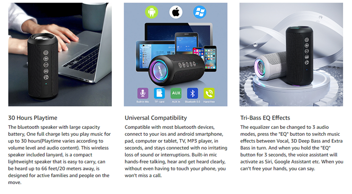 • [30-Hour Playing Time]: The Portable Bluetooth speaker boasts an unbeatable 30 hours(around 65dB) of continuous music playtime or makes calls time(built-in Microphone), Enjoy music day to night never stop!