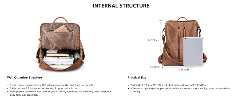 • [PRACTICAL STRUCTURE]: 1 main zipper compartment with 1 interior zipper pocket and 2 interior pockets, 2 side pockets, 2 front zipper pockets, 1 zipper pocket in back. Multi-pockets can hold your 9.7" iPad Pro, magazines, umbrella, water bottle other tiny items. You can use it as everyday backpack or travel backpack.
