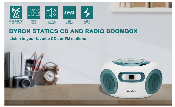 Byron Statics Portable CD Boombox with AM/FM Radio, Top Loading CD, 1W RMS x 2 Stereo Speaker, Aux-in Jack, LCD Display, AC110-120V Operated (KBB-250)
