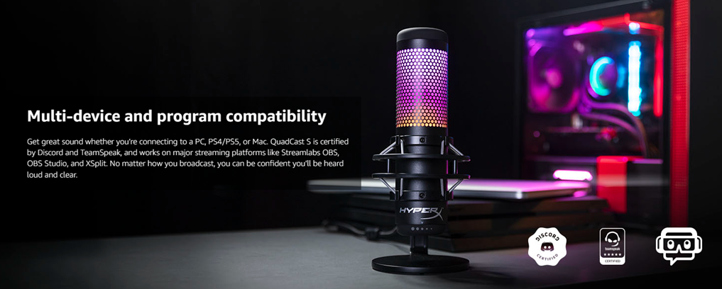 • Multi-device and program compatibility: Get great sound whether you’re connecting to a PC, PS4, or Mac. QuadCast S is certified by Discord and TeamSpeak, and works on major streaming platforms like Streamlabs OBS, OBS Studio, and XSplit.