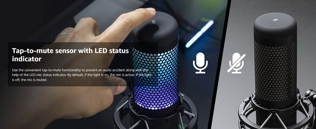 • Tap-to-mute sensor with LED status indicator: Use the convenient tap-to-mute functionality to prevent an audio accident along with the help of the LED mic status indicator. If the light is on, the mic is active, if the light is off, the mic is muted.