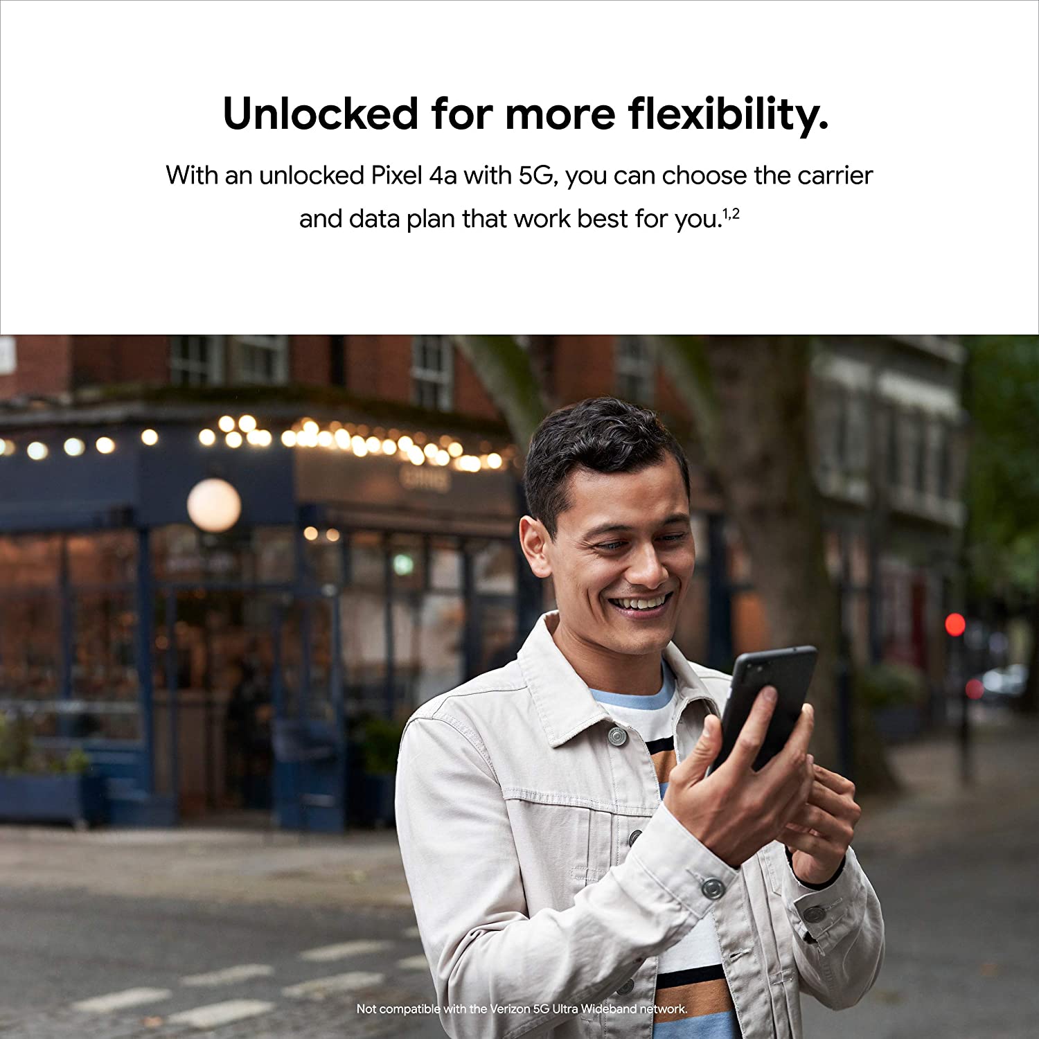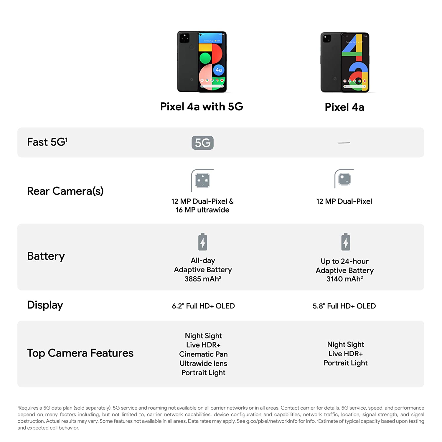 Meet Pixel 4a with 5G, the essential Google phone. It has the helpful stuff you need in a cell phone, with an extra boost of 5G speed. So you can download a movie in seconds, enjoy smooth streaming, and play your favorite games. Pixel 4a with 5G also takes amazing ultrawide photos in any light, keeps your data safe, blocks robocalls, and has an all-day battery that can last up to 48 hours with Extreme Battery Saver. It’s a lot of help from Google, for a lot less than you’d expect. And it’s an unlocked smartphone, so you can choose the data plan and carrier that work for you.[1] Works with all major carriers. Contact carrier for details. 5G service is carrier dependent.[2] Requires a 5G data plan (sold separately). 5G service and roaming not available on all carrier networks or in all areas. Contact carrier for details about current 5G network performance, compatibility, and availability. Phone connects to 5G networks, but 5G service, speed, and performance depend on many factors including, but not limited to, carrier network capabilities, device configuration and capabilities, network traffic, location, signal strength, and signal obstruction. Actual results may vary. Some features not available in all areas. Data rates may apply.[3] Download speed claims based on testing videos from three streaming platforms. Average download time was less than sixty seconds. File sizes varied between 449MB and 1.3GB. Download speed depends upon many factors, such as file size, content provider and network connection. Testing conducted in an internal 5G network lab and on pre-production hardware in California in July/August 2020. Actual download speeds may be slower.[4] Enabling gameplay with cellular data may increase your mobile data usage up to 2.7GB/hr. Gameplay is service-, network-, connection-, and game-dependent, and may not be available for all games in all areas. Users may experience inconsistent gameplay. Stadia requires account creation.[5] Hotspot capability subject to carrier plan.[6] For “All day”: Maximum battery life based on testing using a mix of talk, data, standby, and use of other features. Testing conducted on two major carrier networks using Sub-6 GHz non-standalone 5G (ENDC) connectivity. For “Up to 48 hours”: Maximum battery life based on testing using a mix of talk, data, standby, and use of limited other features that are default in Extreme Battery Saver mode (which disables various features including 5G connectivity). Testing conducted on two major carrier networks. For both claims: Pixel 4a (5G) and Pixel 5 battery testing conducted by a third party in California in mid 2020 on pre-production hardware and software using default settings, except that, for the “up to 48 hour claim” only, Extreme Battery Saver mode was enabled. Battery life depends upon many factors and usage of certain features will decrease battery life. Actual battery life may be lower.[7] Android version updates for at least 3 years from when the device first became available on the Google Store in the US. [8] US only. English only. Call Screen may not detect all spam calls.[9] Screen sharing not available on group calls. Requires Wi-Fi or 5G internet connection. Not available on all apps and content. Data rates may apply. 5G service, speed and performance depend on many factors including, but not limited to, carrier network capabilities, device configuration and capabilities, network traffic, location, signal strength, and signal obstruction.[10] Some third-party apps and data may not be transferred automatically.[11] Subscriptions may be required.[12] Compared to MSRP of unlocked Pixel 5 phone on the Google Store in the US. Requires a 5G data plan (sold separately). 5G service and roaming not available on all carrier networks or in all areas. Contact carrier for details about current 5G network performance, compatibility, and availability. Phone connects to 5G networks, but 5G service, speed, and performance depend on many factors including, but not limited to, carrier network capabilities, device configuration and capabilities, network traffic, location, signal strength, and signal obstruction. Actual results may vary. Some features not available in all areas. Data rates may apply.[13] Not available for all apps and content. Display automatically adjusts to optimize for best viewing and battery performance.[14] Qualcomm Snapdragon is a product of Qualcomm Technologies, Inc. and/or its subsidiaries. Qualcomm and Snapdragon are trademarks of Qualcomm Incorporated, registered in the United States and other countries.[16] Storage specifications refer to capacity before formatting. Actual formatted capacity will be less.[17] Qi-compatible. Wireless charger sold separately.[18] Up to 18W wired charging rates are based upon use of the included charger plugged into a wall outlet. Actual results may be slower.[19] Charging rates are based upon use of the included charger plugged into a wall outlet. Actual results may vary.[20] Designed to charge Qi-certified devices. Use of Battery Share significantly reduces Pixel battery life. Cases may interfere with charging and will reduce charging speed.