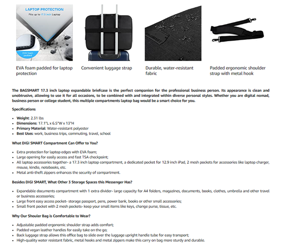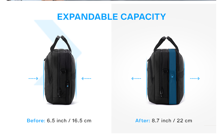 • EXPANSION & MULTIPLE COMPARTMENTS- 17.1"L x 6.5''(up to 8.7'') W x 13"H; weight: 2.31 lbs. The expansion zipper makes it more flexible, the laptop briefcase can be transformed as a large duffel bag when necessary. Up to 4 compartments can meet all your needs well. The large tech compartment can fit up to 17-17.3 inch laptop. Two front pockets allow you to put daily necessities in an organized manner.The expandable document compartment can storage your A4 folders, magazines, clothes or umbrella.