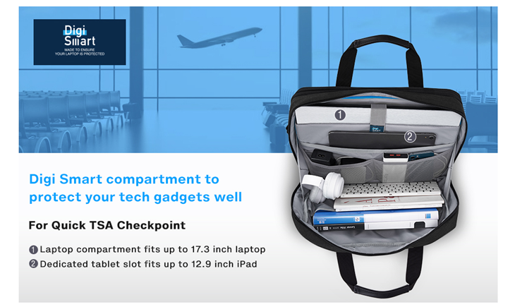 • TSA FRIENDLY & ANTITHEFT- Convenient at checkpoint. A separate tech compartment with large opening design can make you quickly pass at airport security, also keeping your laptop, 12.9'' iPad and other tech gadgets tidy. Its metal anti-theft zippers will enhance the security of the computer bag.