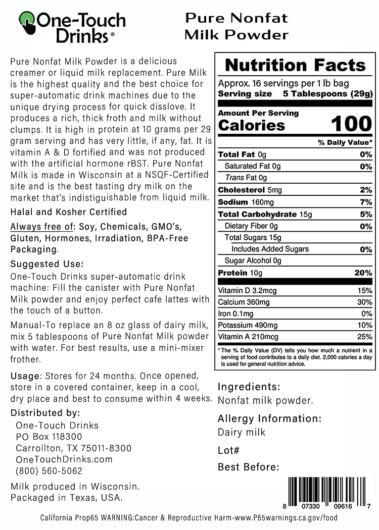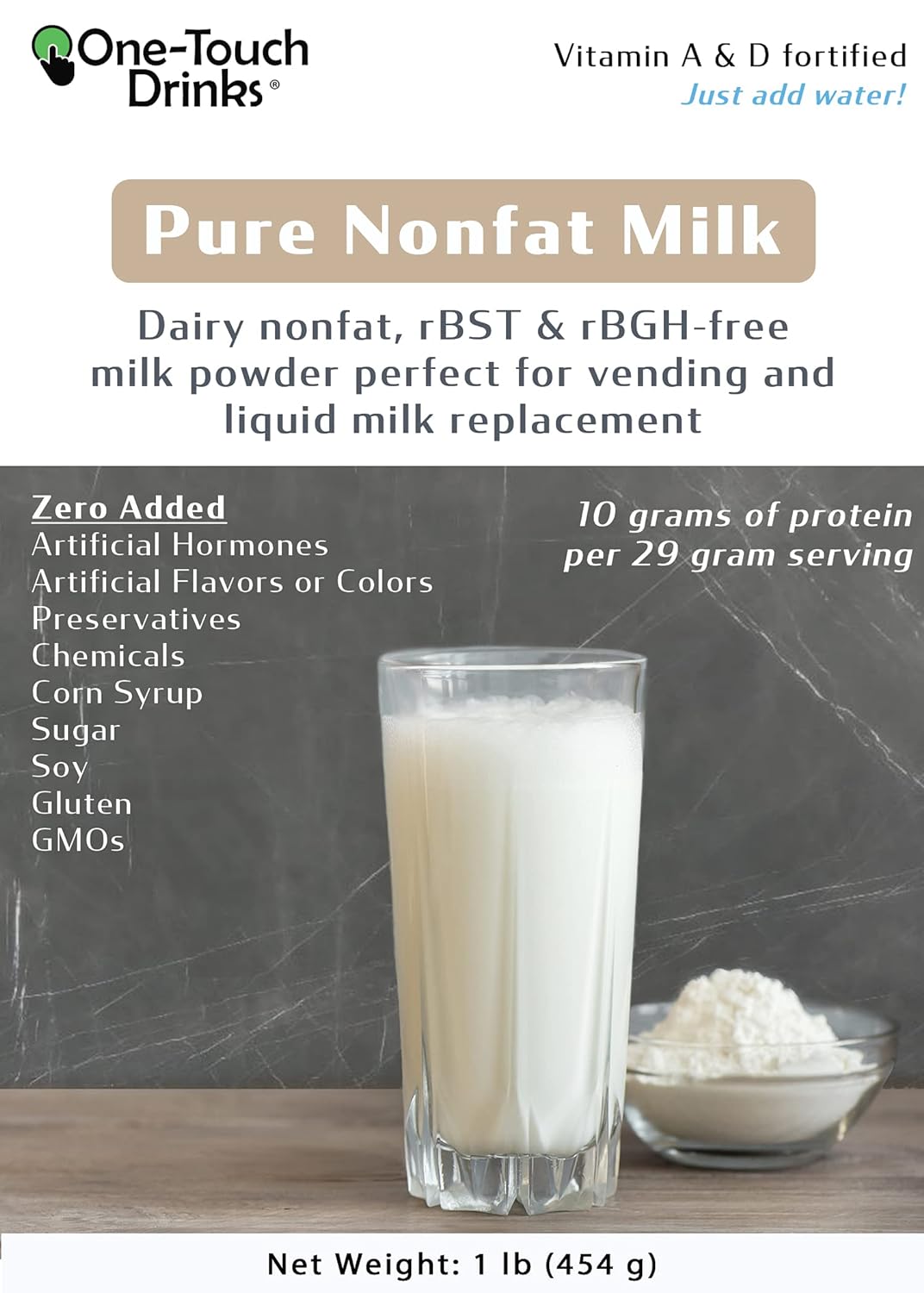 • One-Touch Drinks Pure Nonfat Milk makes thick, rich froth when whipped and is perfect for use in super-automatic machines to serve barista-quality cappuccino, lattes, and mochas.
